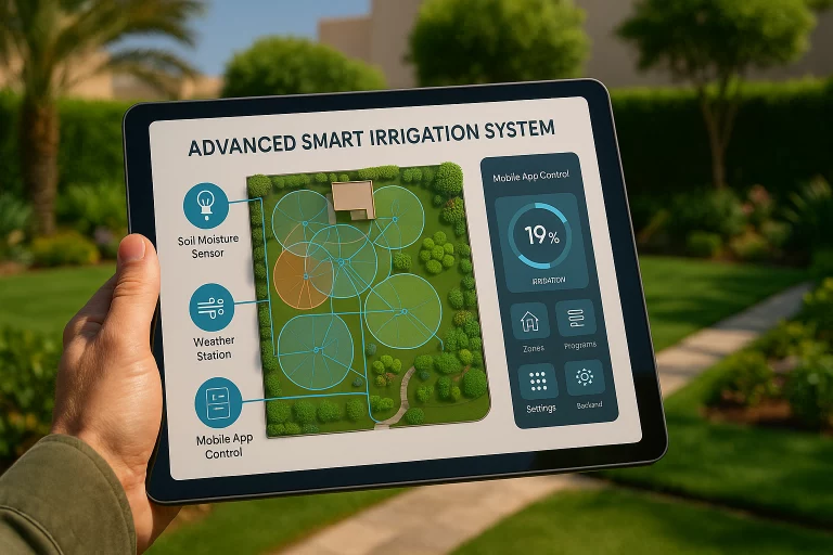 نظام الري الذكي الحدائق الفاخرة، الفلل الخاصة، المساحات المعقدة تحكم عن بعد عبر الهاتف، استجابة للظروف الجوية، توفير المياه بنسبة تفوق 70%، مراقبة الاستهلاك بدقة